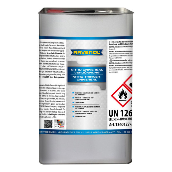 RAVENOL Nitro-Universal-Verdünnung is used for thinning nitro, nitro-combination, chlorinated rubber, air-drying and oven-drying synthetic resin lacquers, as well as air- and oven-drying Zapon lacquers. Dissolves neoprene glue and removes its residues. Removes colour and grease stains (caution with synthetic fibres). Glues polystyrene and acrylic glass.