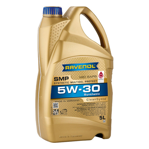 RAVENOL SMP SAE 5W-30 синтетичко, лако тече, моторно уље средње количине пепела (MID SAPS) направљено коришћењем CleanSynto® технологије за путничке бензинске и дизел моторе са и без турбо пуњења и директним убризгавањем горива. Минимизира трење, хабање, смањује потрошњу горива, обезбеђује одлична својства при хладном старту. Продужени интервали замене према захтевима произвођача аутомобила.