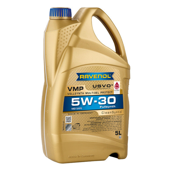 RAVENOL VMP 5W-30 је потпуно синтетичко, лако тече, моторно уље средње количине пепела (MID SAPS) произведено коришћењем USVO® и CleanSynto® технологије за путничке бензинске и дизел моторе са и без турбо пуњења и директним убризгавањем горива. Продужени интервали замене према захтевима произвођача возила.